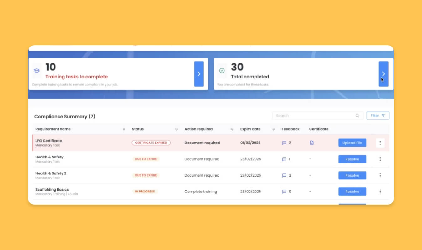 Real-time compliance tracking and colour-coded dashboards show who’s compliant and who’s not.